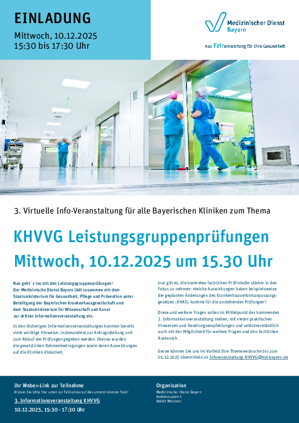 Gerne können Sie uns im Vorfeld Ihre Themenwünsche bis zum 01.12.2025 übermitteln an Infoveranstaltung-KHVVG(at)md-bayern.de